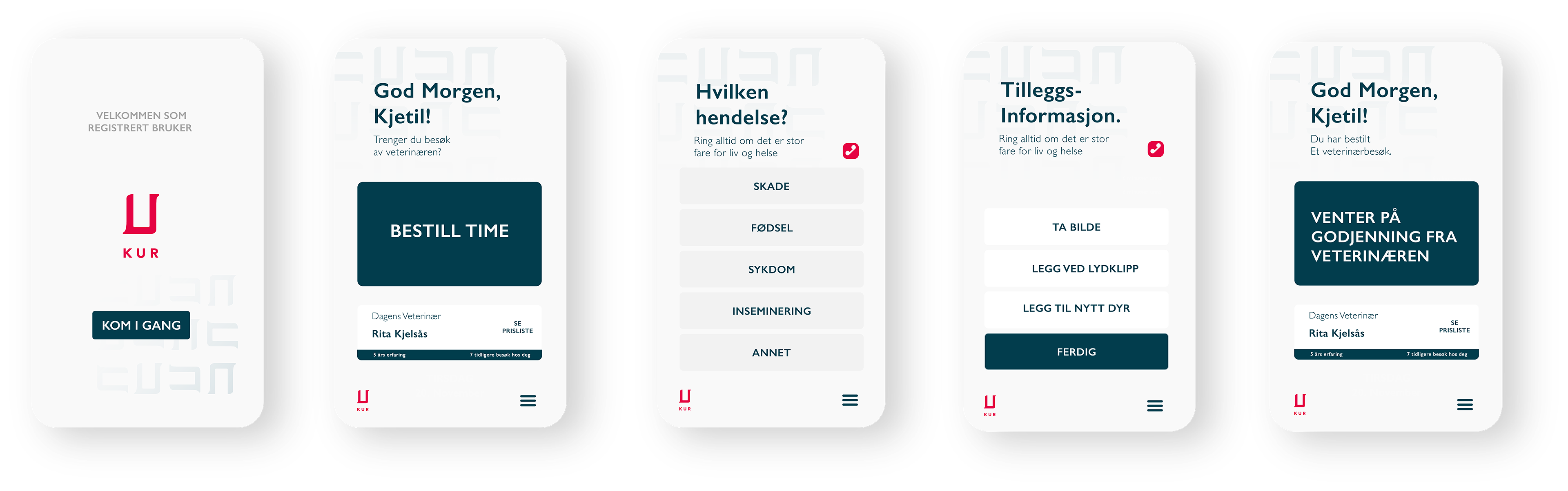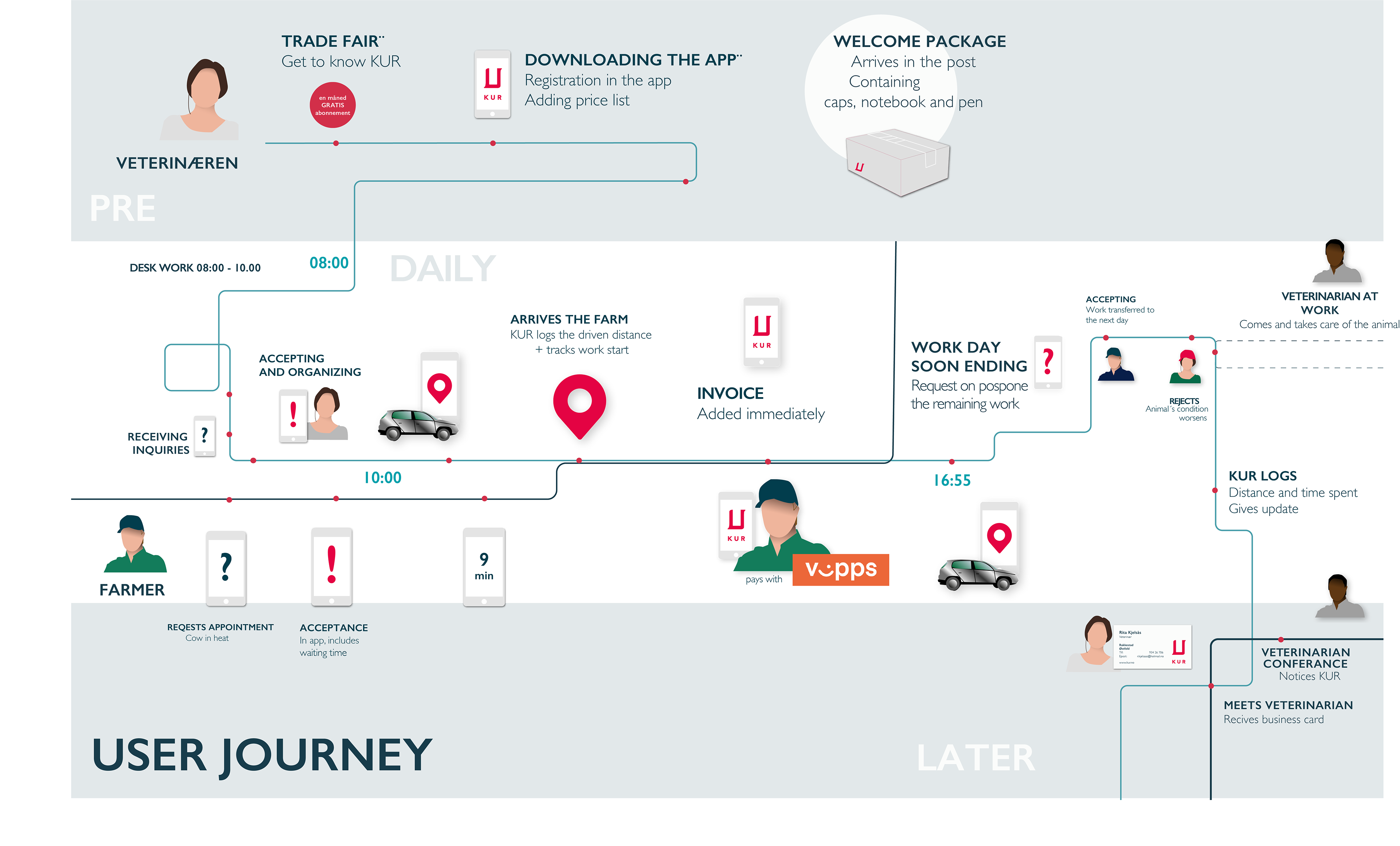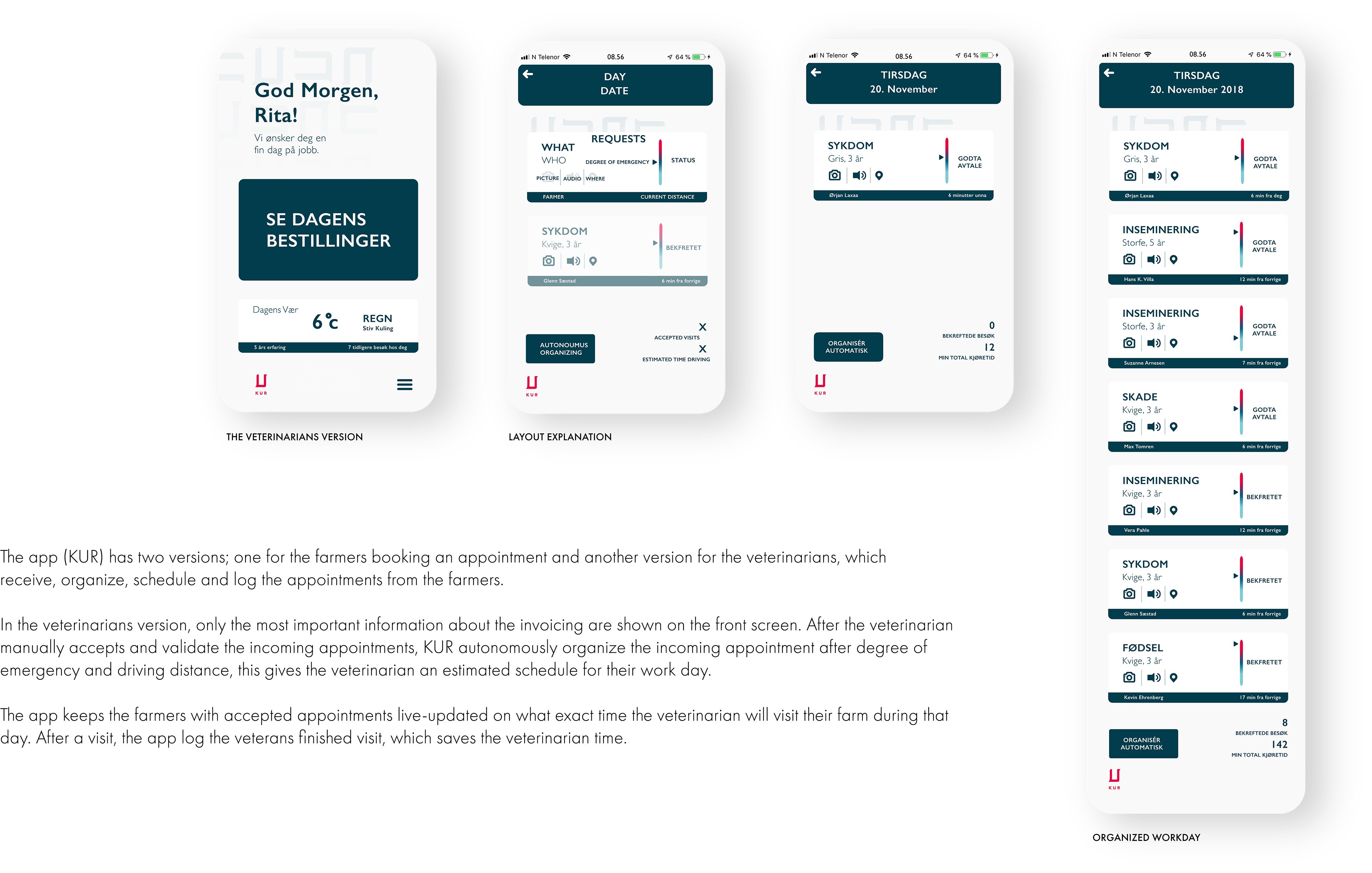 The app "KUR" is the outcome of an in-depth user centered research process. We started the project with an aim of exploring a field in Norway that deserved some extra attention regarding new services. This open way of thinking led us deep into the Norwegian farmland and how veterinarians and farmers work together in the Norwegian agriculture. By interviewing several farmers, we found many challenges in their communication with the veterinarians. Common issues were; unstandardized pricing of the services, scheduling, limited work capacity and stress. These insights made us shift our main focus from the farmers to the veterinarians. New interview rounds with veterinarians made us realize how though the business of being a veterinarian really can be.